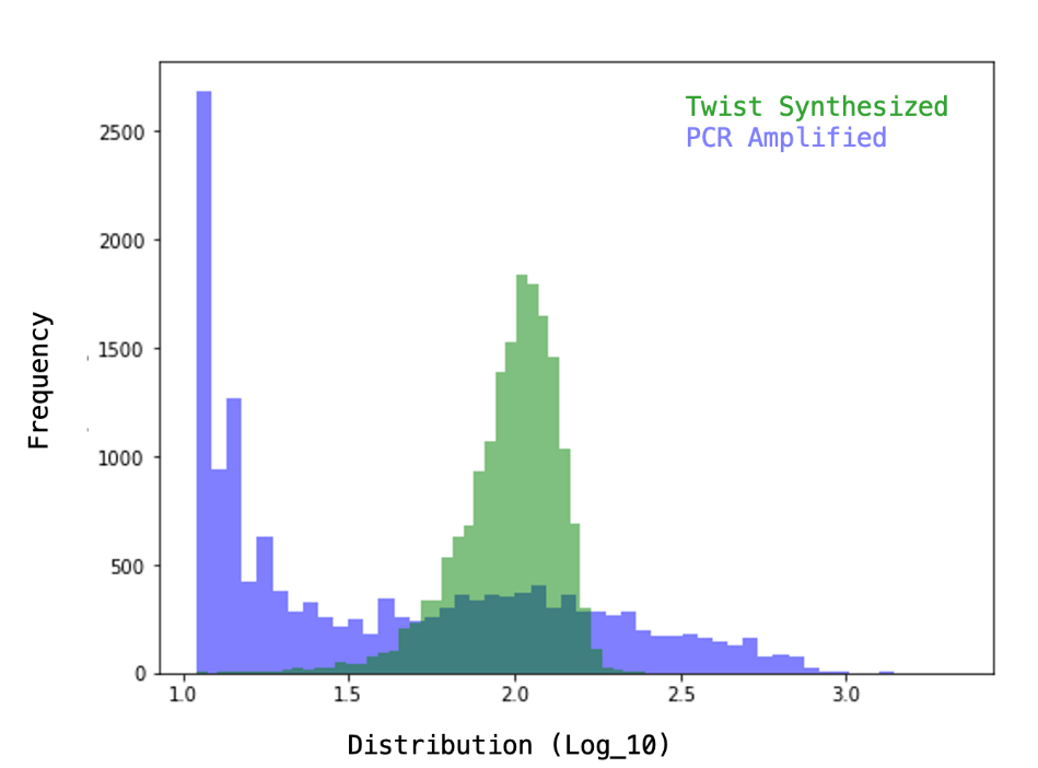 Kumarら(2020)の図2cより改変。Twistのオリゴプール合成から作成されたAAVカプシドライブラリは、PCR増幅で作成された同等のライブラリと比べて、はるかに均一であることが示されました。