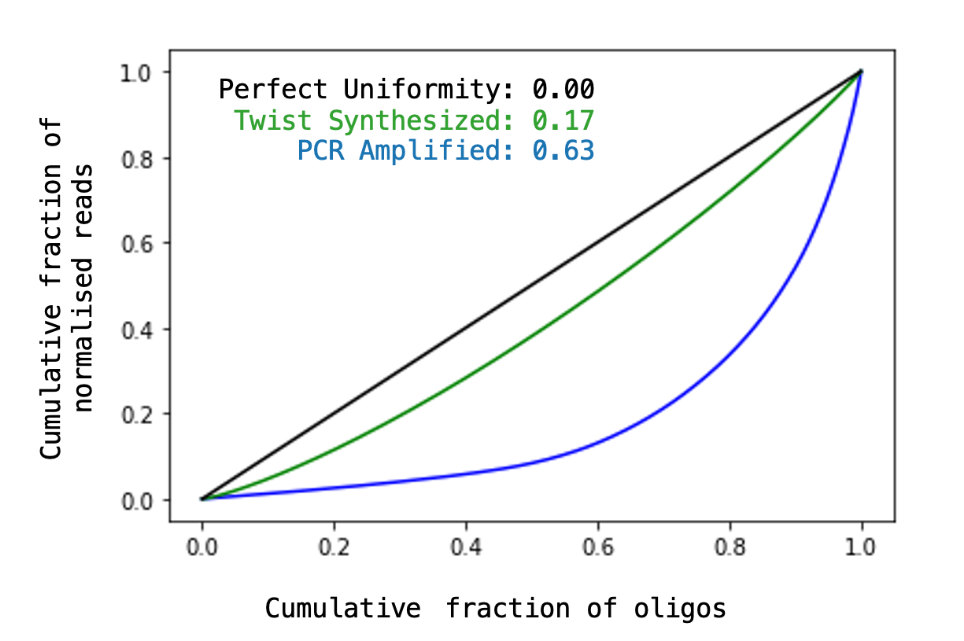Kumarら(2020)より改変。Twistのオリゴプール合成から作成されたAAVカプシドライブラリは、PCR生成ライブラリと比較して、はるかに高い均一性を示しました。ここでは、理論上の完全な均一性(すべてのオリゴヌクレオチドが等しく分布する状態)を示すローレンツ曲線(黒線)を示しています。