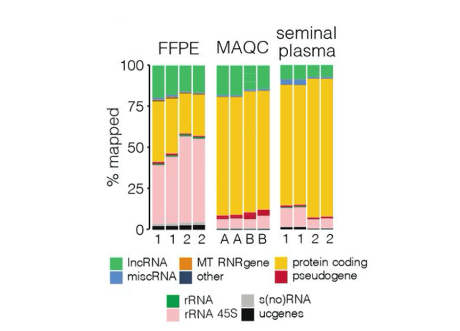 研究では、がん研究者が遭遇する可能性のあるさまざまなサンプルタイプ(精液中の血漿、血小板除去血漿、FFPE腫瘍サンプル、MAQCA/B)を用いて比較した結果、以下の成果が示されました。
