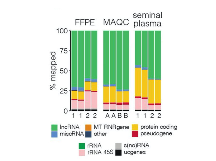 - FFPE、MAQCA/B、精液血漿サンプルにおいて、それぞれ3.5倍、4倍、8倍のリードがlncRNAにマッピングされる割合が増加