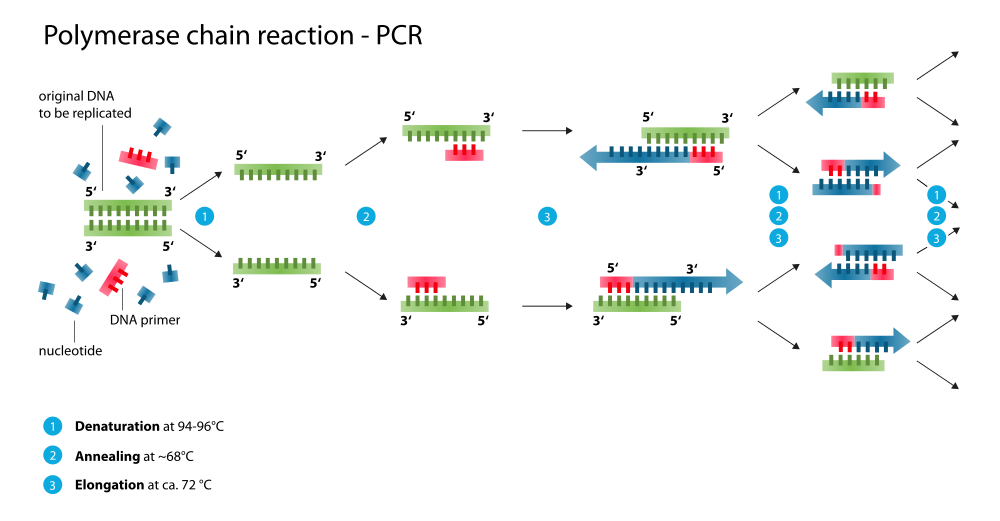 ポリメラーゼ連鎖反応(PCR)の基本的な仕組み。赤色で示されたオリゴ核酸の使用に注意。(出典: ウィキコモンズ、作者: Enzoklop)