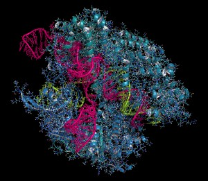 CRISPRシステムの一部として「はさみ」のようにDNA主鎖の化学結合を切断する酵素Cas9の三次元タンパク質構造。