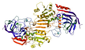 アルコール脱水素酵素の三次元タンパク質構造。体内でアルコール飲料から摂取されたエタノールをアセトアルデヒドに変換する酵素。